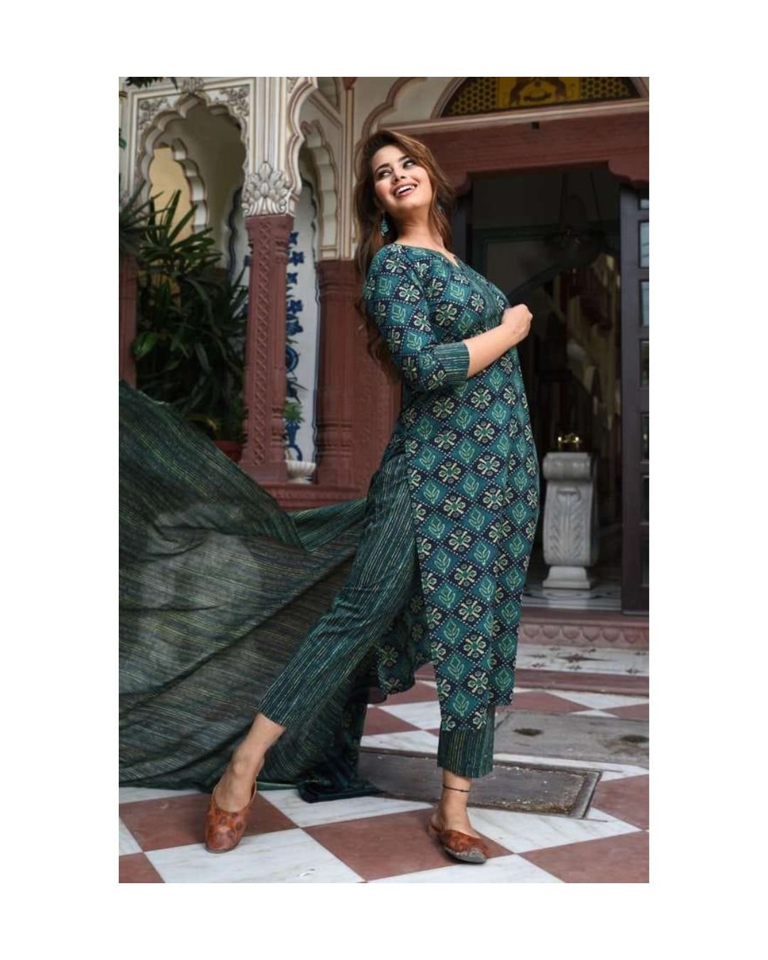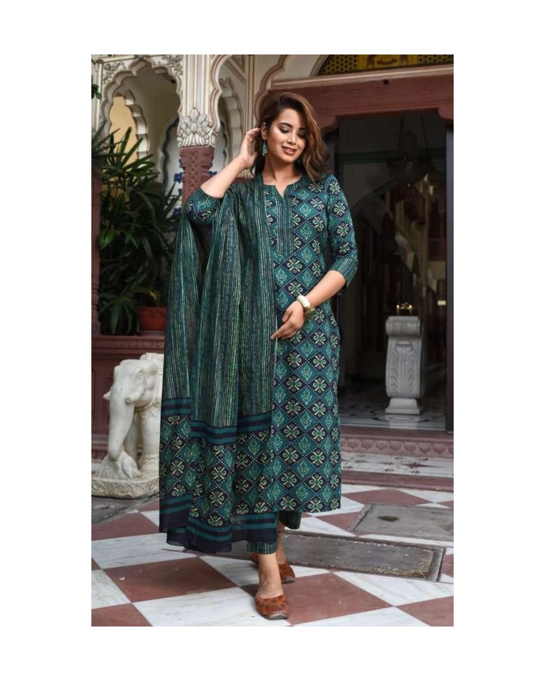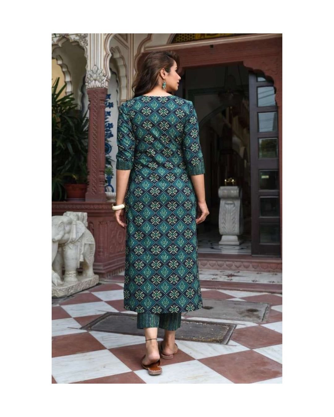 This is a stunning green and blue printed ethnic suit set, perfect for festive and casual occasions. The kurta features an intricate geometric block print pattern in teal, navy, and white hues, creating a visually striking contrast. It has a straight-cut silhouette with a notched round neckline and three-quarter sleeves, giving it a modern yet traditional appeal.