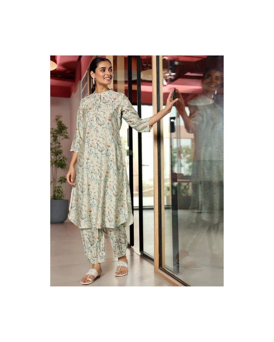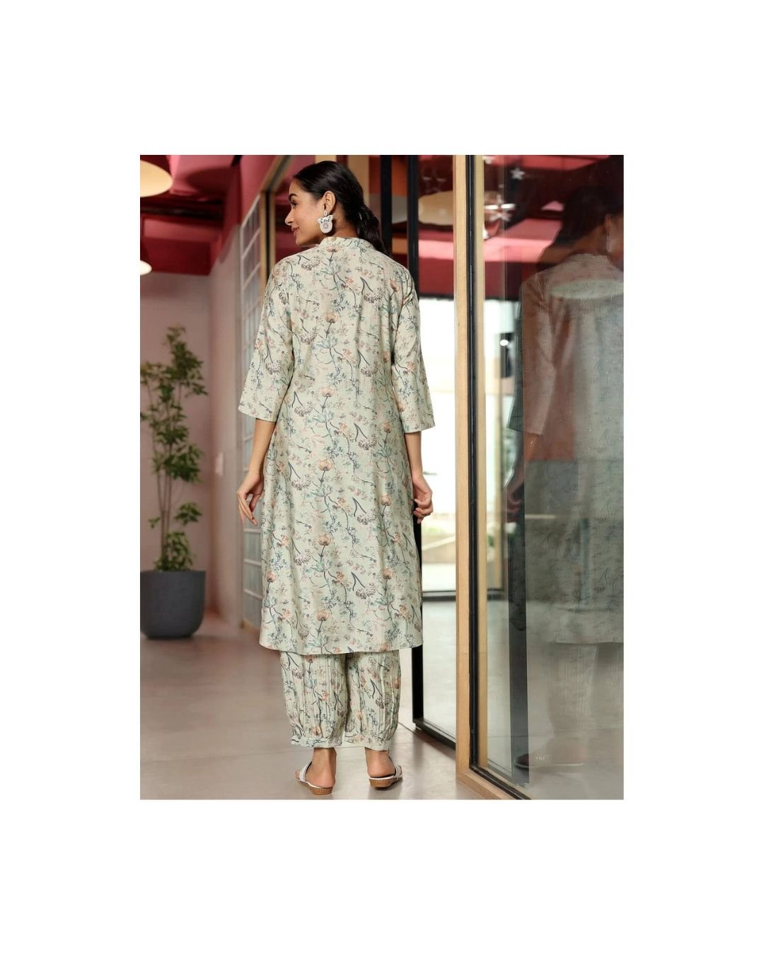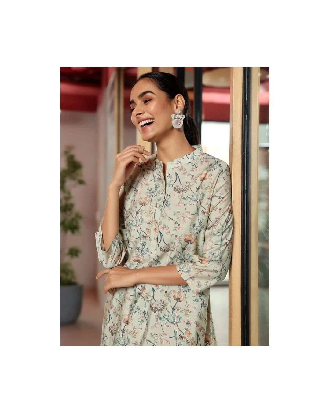 Designed with a structured mandarin neckline and high-low hemline, it flatters without fuss. The coordinated pants echo the print, giving the whole look a breezy harmony. Whether you’re heading to a serene brunch or a workday that demands grace, this set moves with you, lightly and beautifully.