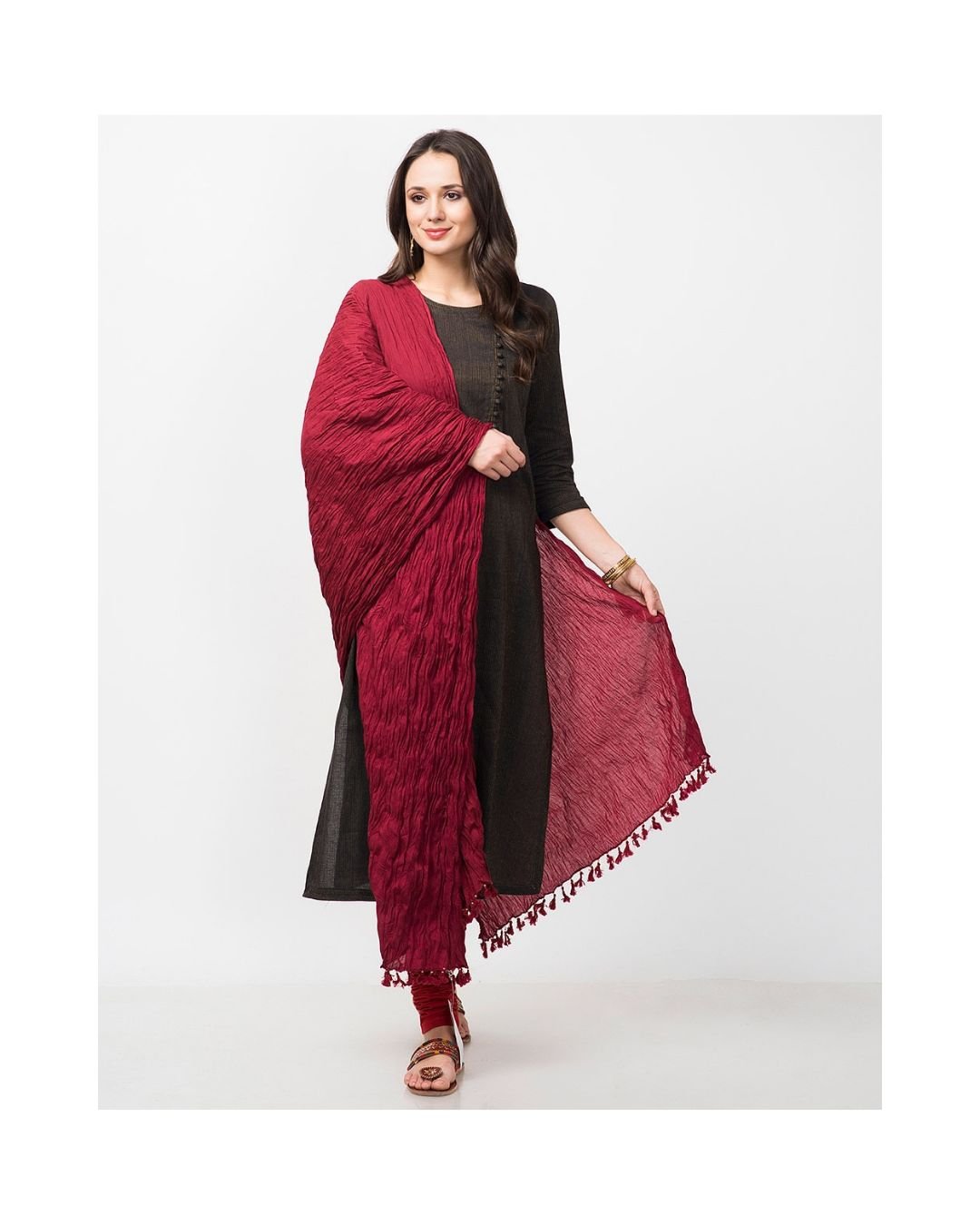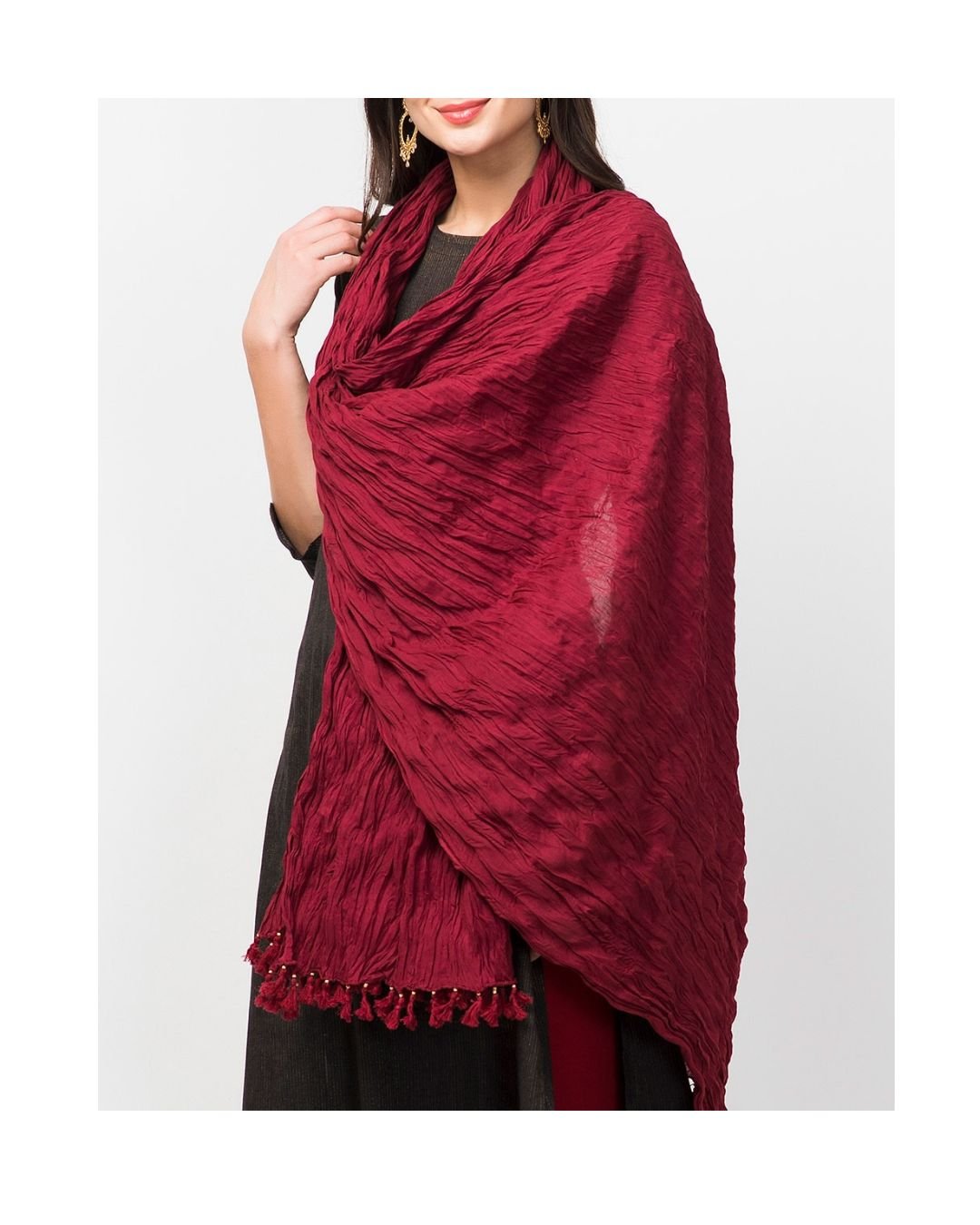 Add a touch of effortless elegance to your ethnic wardrobe with this stunning crushed maroon dupatta, designed to blend tradition with contemporary chic.