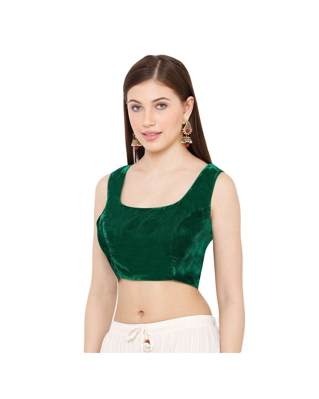 Add a luxurious touch to your ethnic wear collection with this emerald green velvet blouse, designed to make you stand out effortlessly. Crafted from rich velvet fabric, this sleeveless blouse features a soft sheen and a structured fit that flatters all body types.