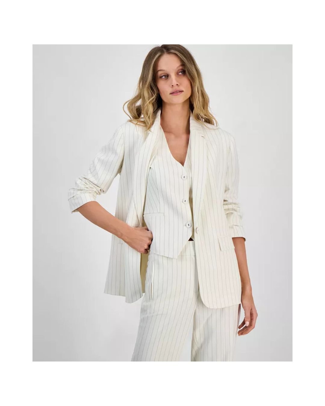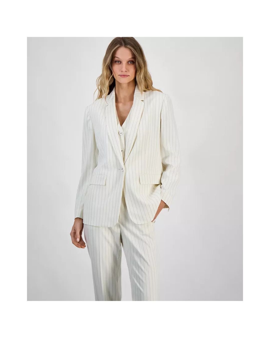 Bring a touch of classic European sophistication to your wardrobe with this ivory white pinstripe blazer. Tailored to perfection, this blazer features clean vertical stripes that elongate the silhouette and enhance a taller, slimmer look. The design includes notched lapels, structured shoulders, and a two-button front closure, making it ideal for both formal meetings and chic events.