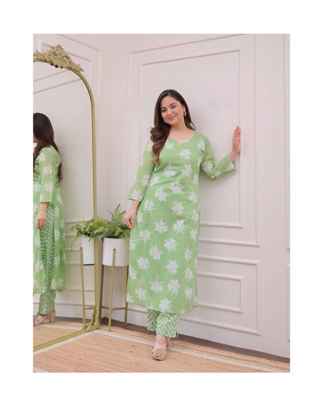 This soft and soothing light green kurta set radiates grace and freshness. The kurta is adorned with delicate white floral prints spread evenly across the fabric, offering a clean and elegant look. It features a straight silhouette with a round neckline and full sleeves, which balances simplicity with style.
