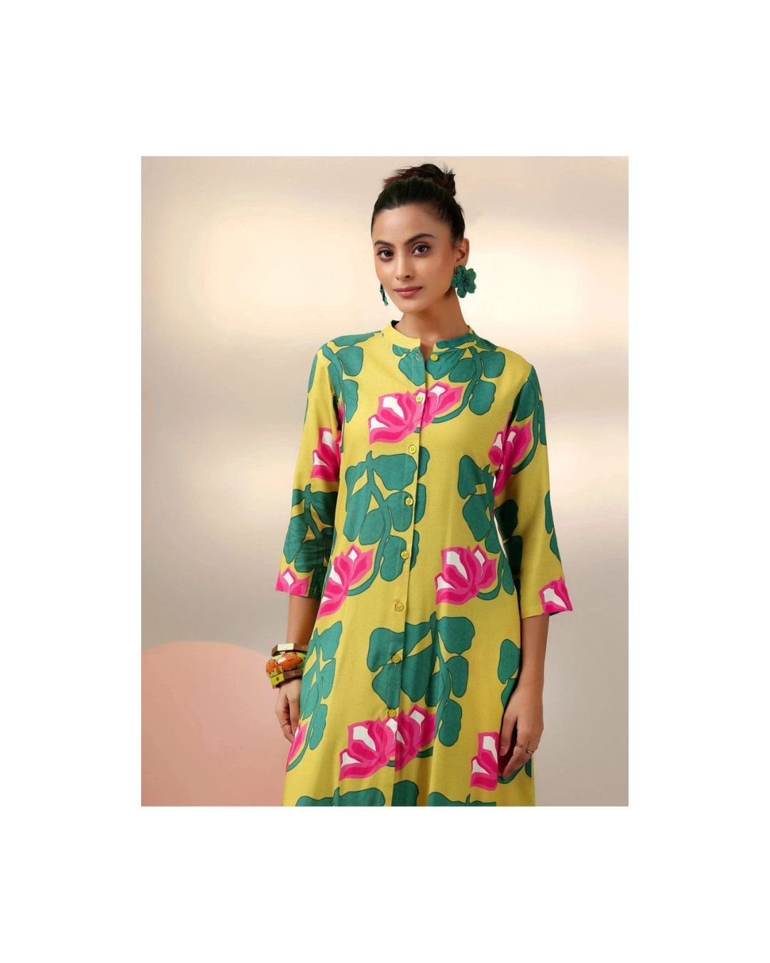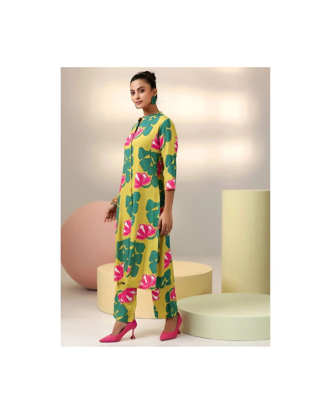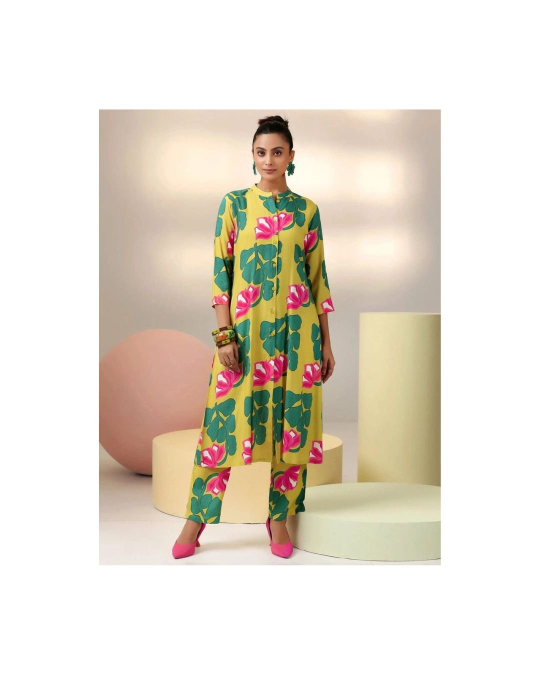 Lime Yellow Bold Floral Co-ord Set with Shirt Kurta and PantsLime Yellow Bold Floral Co-ord Set with Shirt Kurta and Pants
