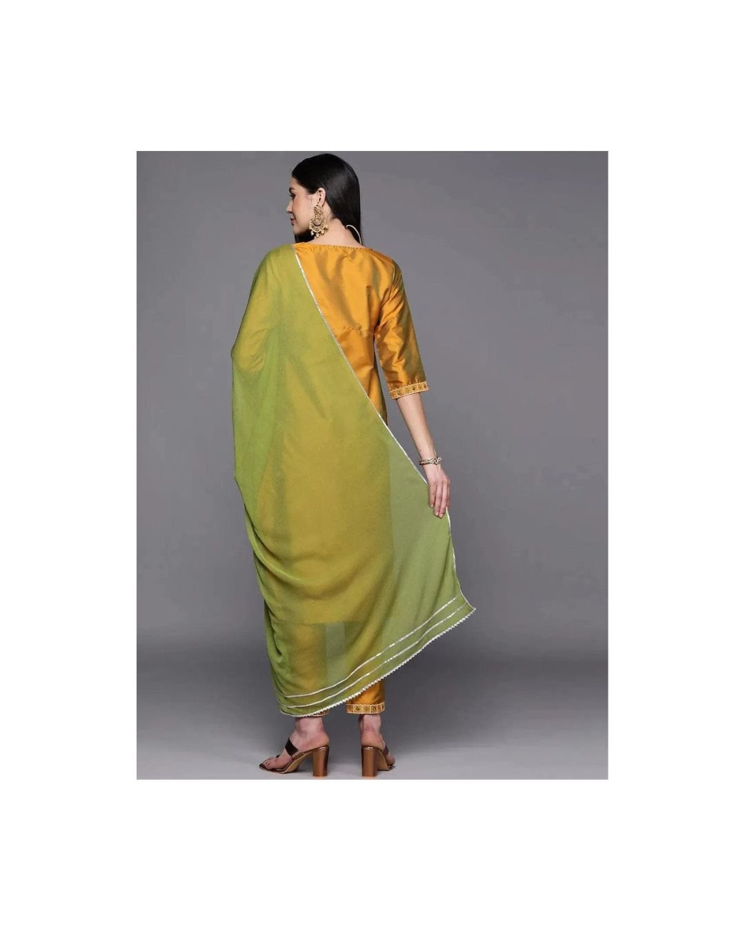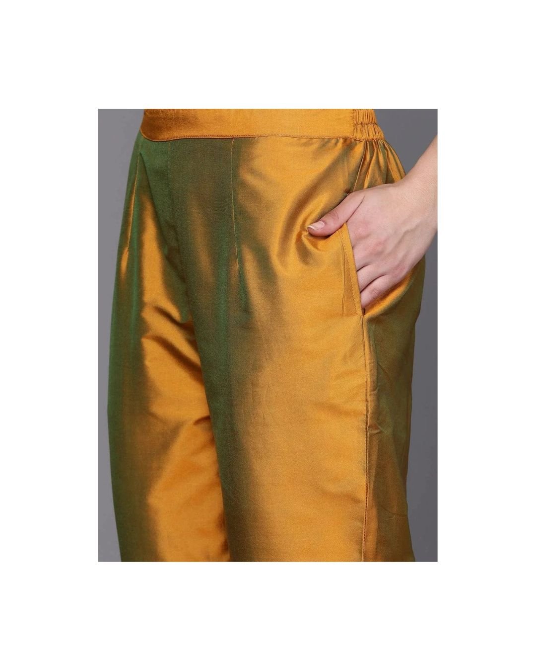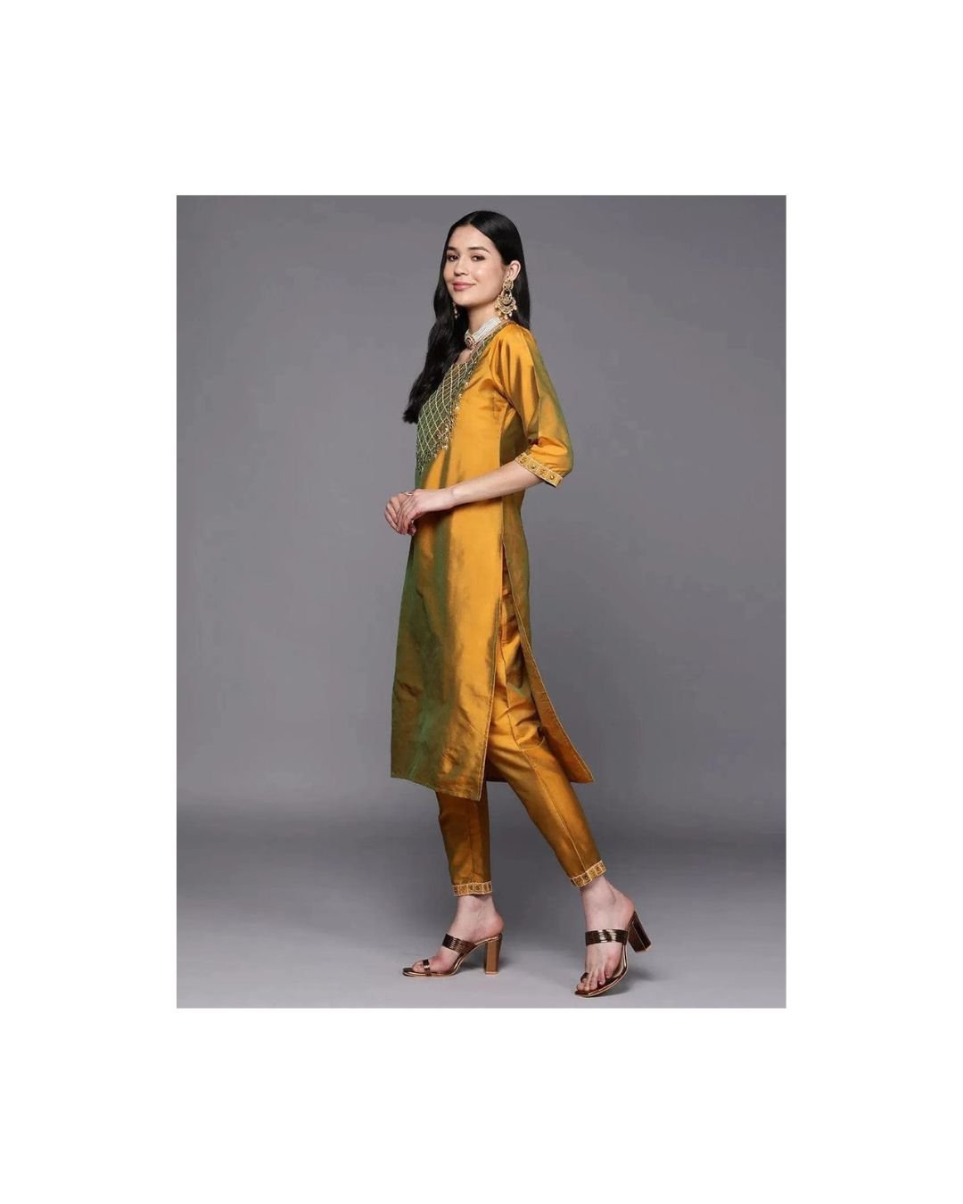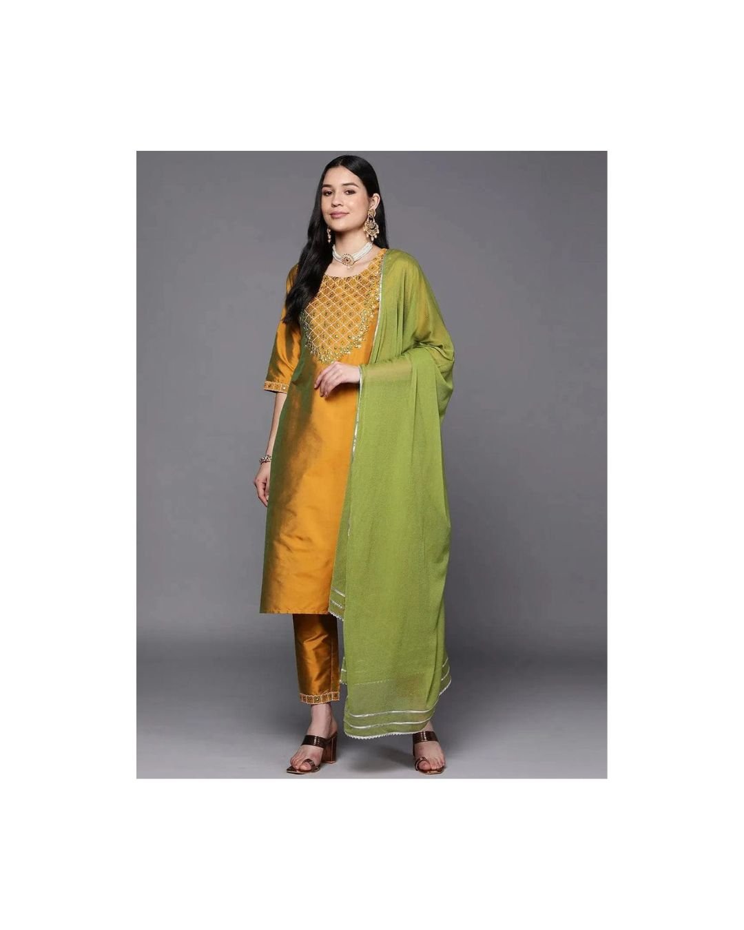 Make a sophisticated statement at your next festive celebration with this Mustard Yellow Silk Blend Embroidered Kurta Set, paired elegantly with a contrast green dupatta. Crafted with rich fabric and intricate detailing, this ensemble is a perfect blend of traditional elegance and regal flair.