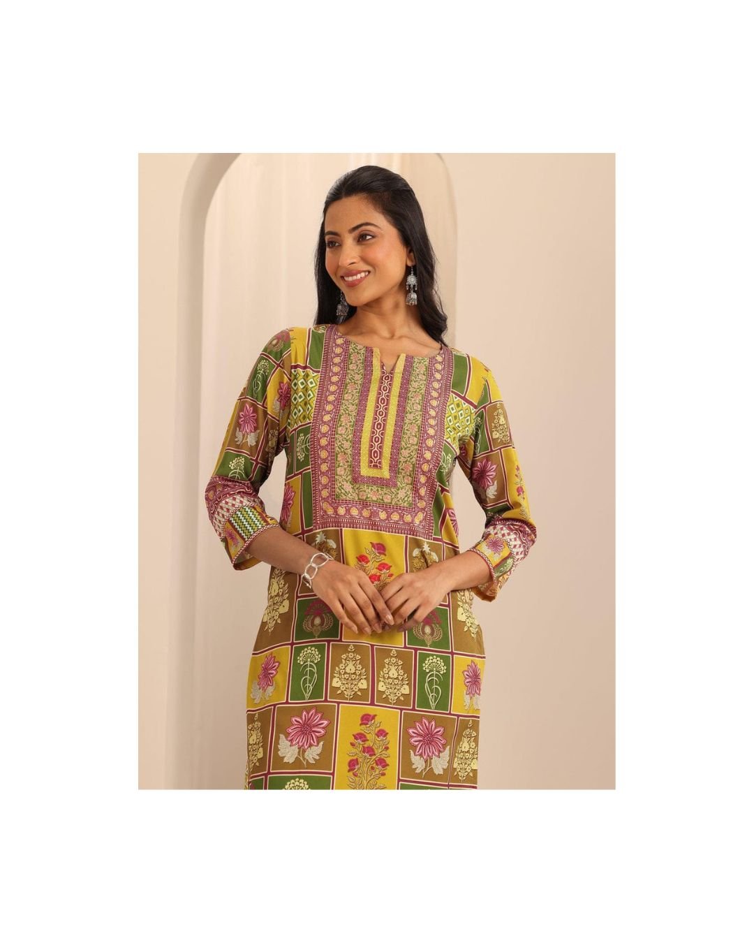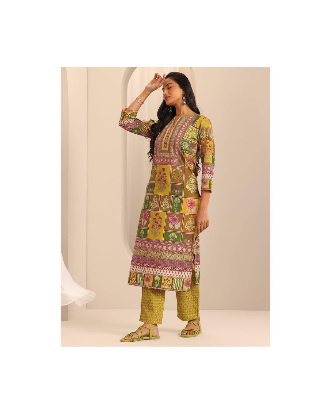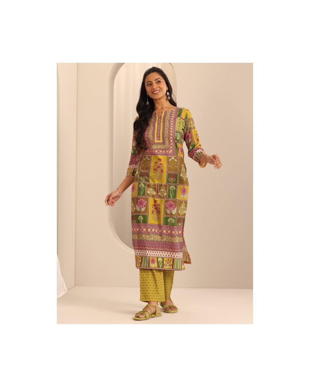 This eye-catching kurta set is a vibrant fusion of traditional prints and contemporary styling. The kurta features a straight silhouette in a rich olive mustard base, adorned with multi-colored block-style floral and ethnic motifs. The design is a collage of bold square panels, each showcasing intricate flower and leaf prints in contrasting shades of green, pink, mustard, maroon, and off-white.