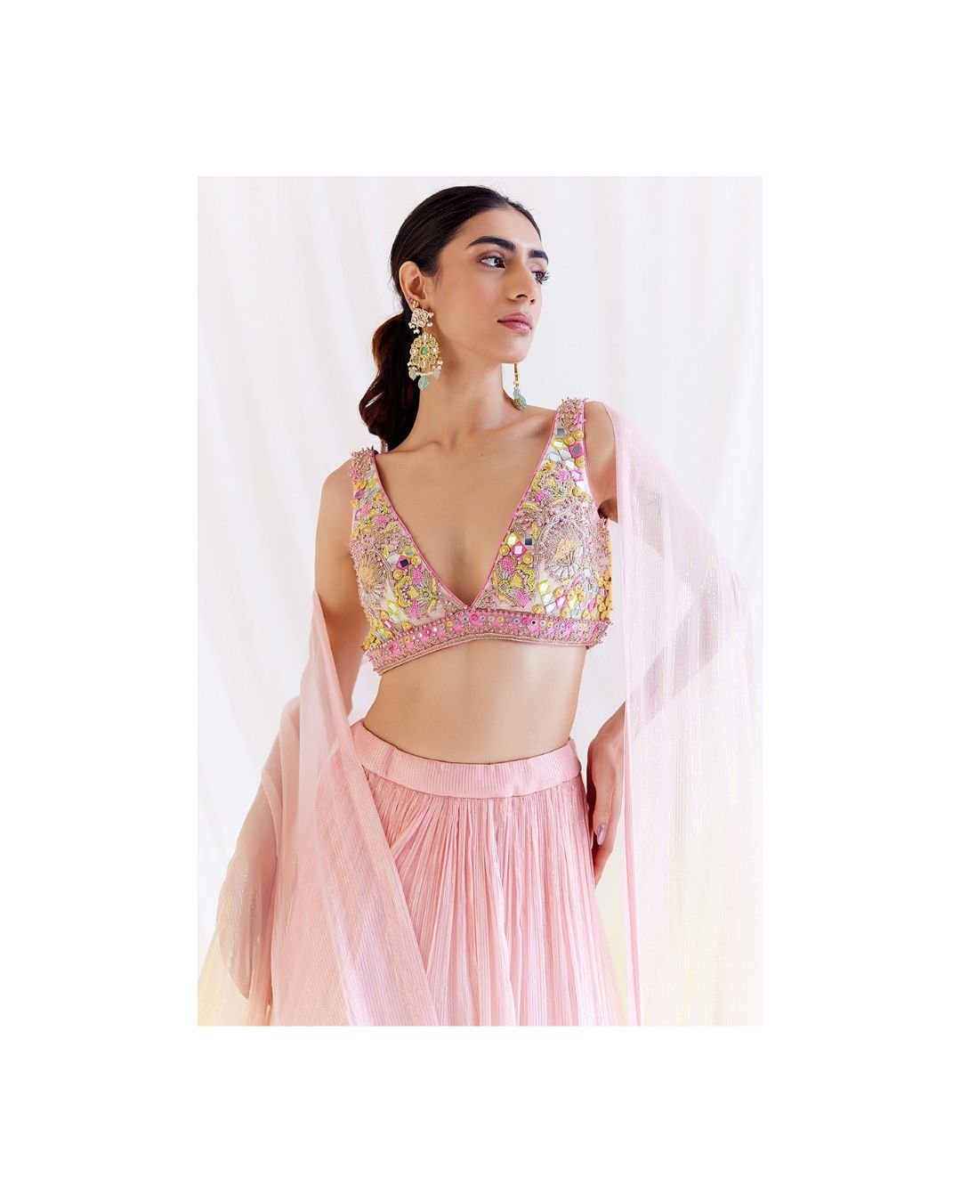 Paired with a feather-light net dupatta that mirrors the color story of the outfit, this ensemble offers a perfect fusion of movement and minimalism. The tassel accents on the lehenga waistband add a playful touch, ideal for twirls on the dance floor.