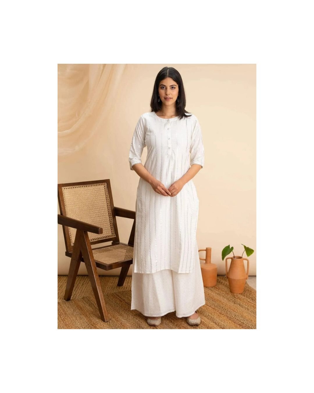Grace your ethnic wardrobe with the timeless beauty of the Serene Glow White Embroidered Kurta Set, designed for women who appreciate subtle sophistication and comfort. This all-white ensemble exudes effortless charm with its delicate vertical thread embroidery that adds graceful structure to the kurta.