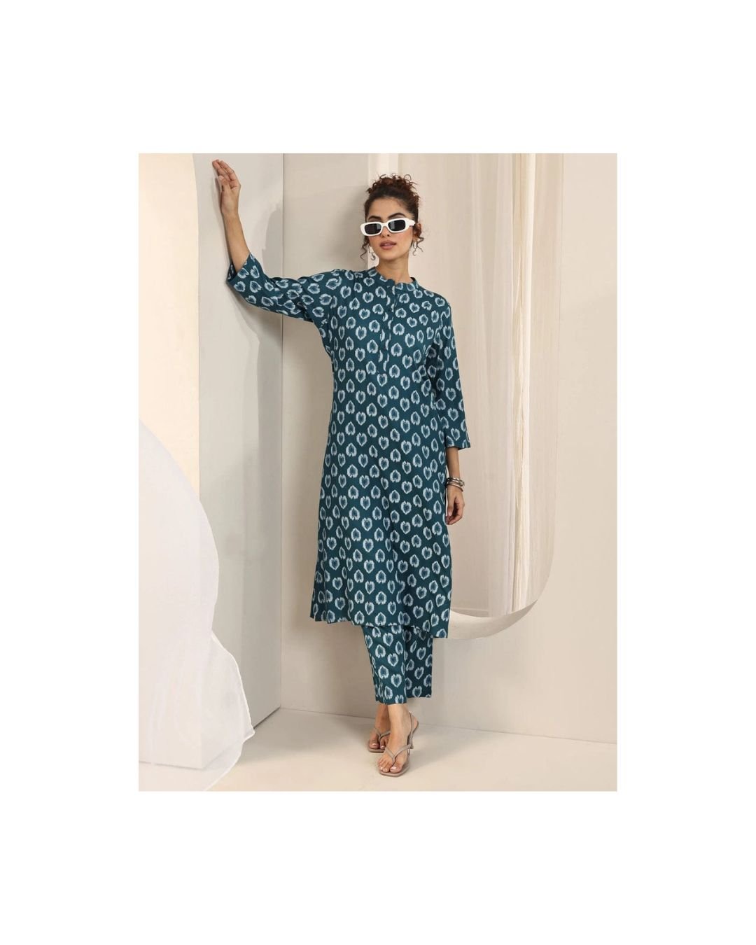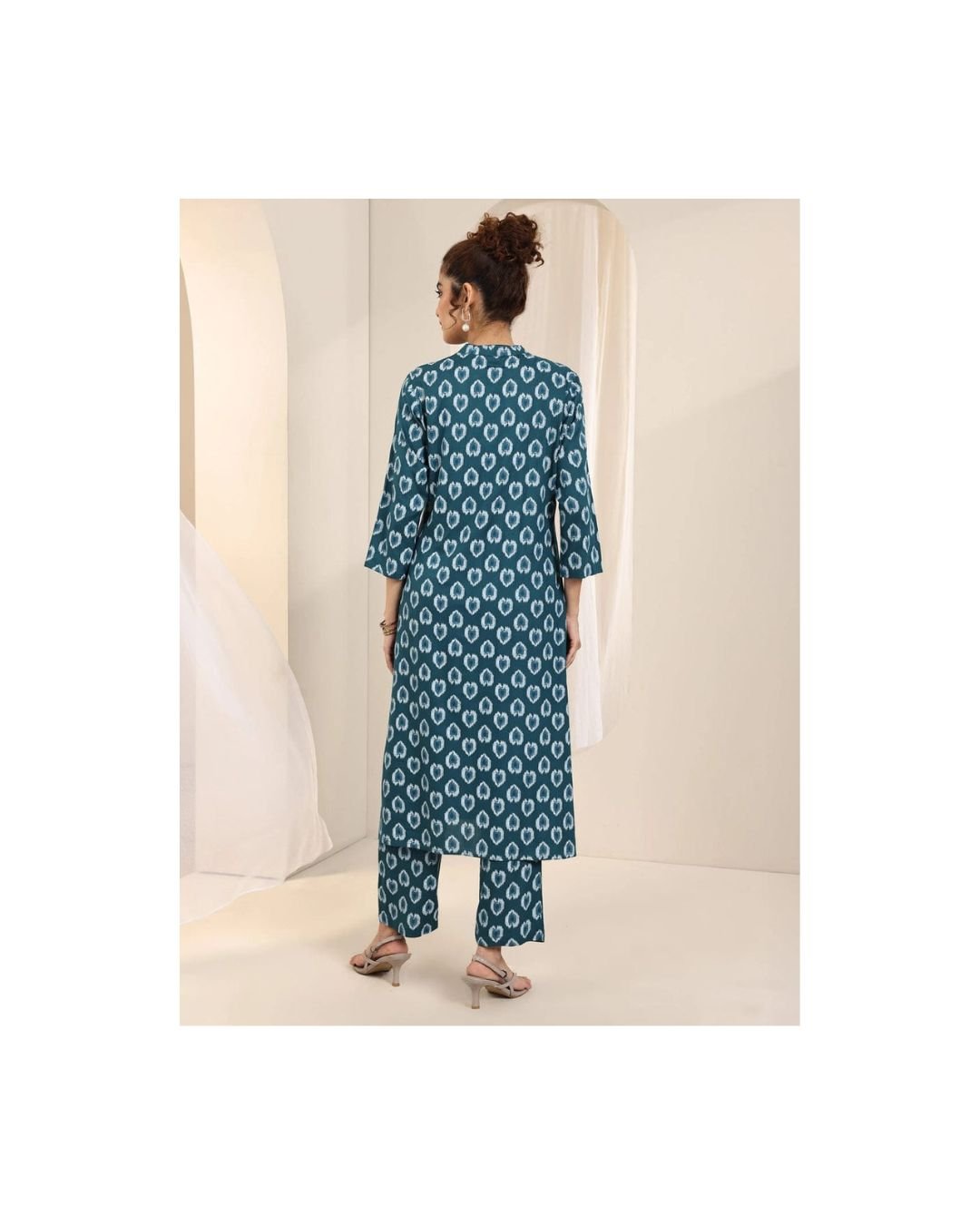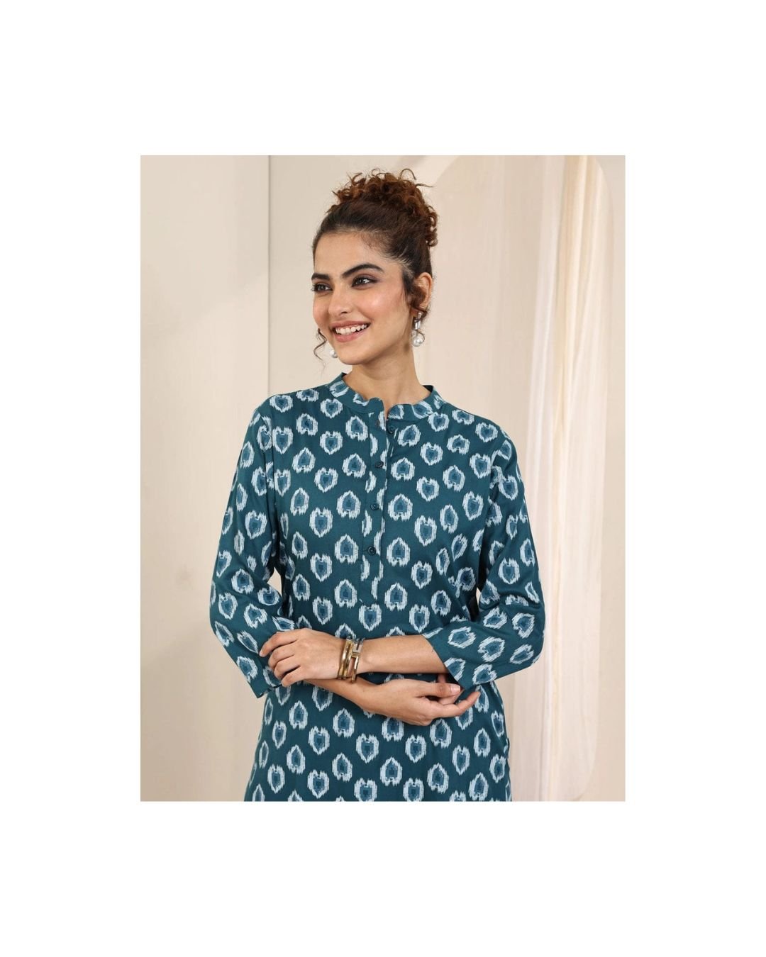 Its charm lies in the ikat-inspired print — abstract, repetitive motifs in white against a rich teal canvas, evoking artisanal strength with a contemporary heartbeat. Paired with ankle-length straight pants in the same print, the outfit holds harmony and balance from head to toe.