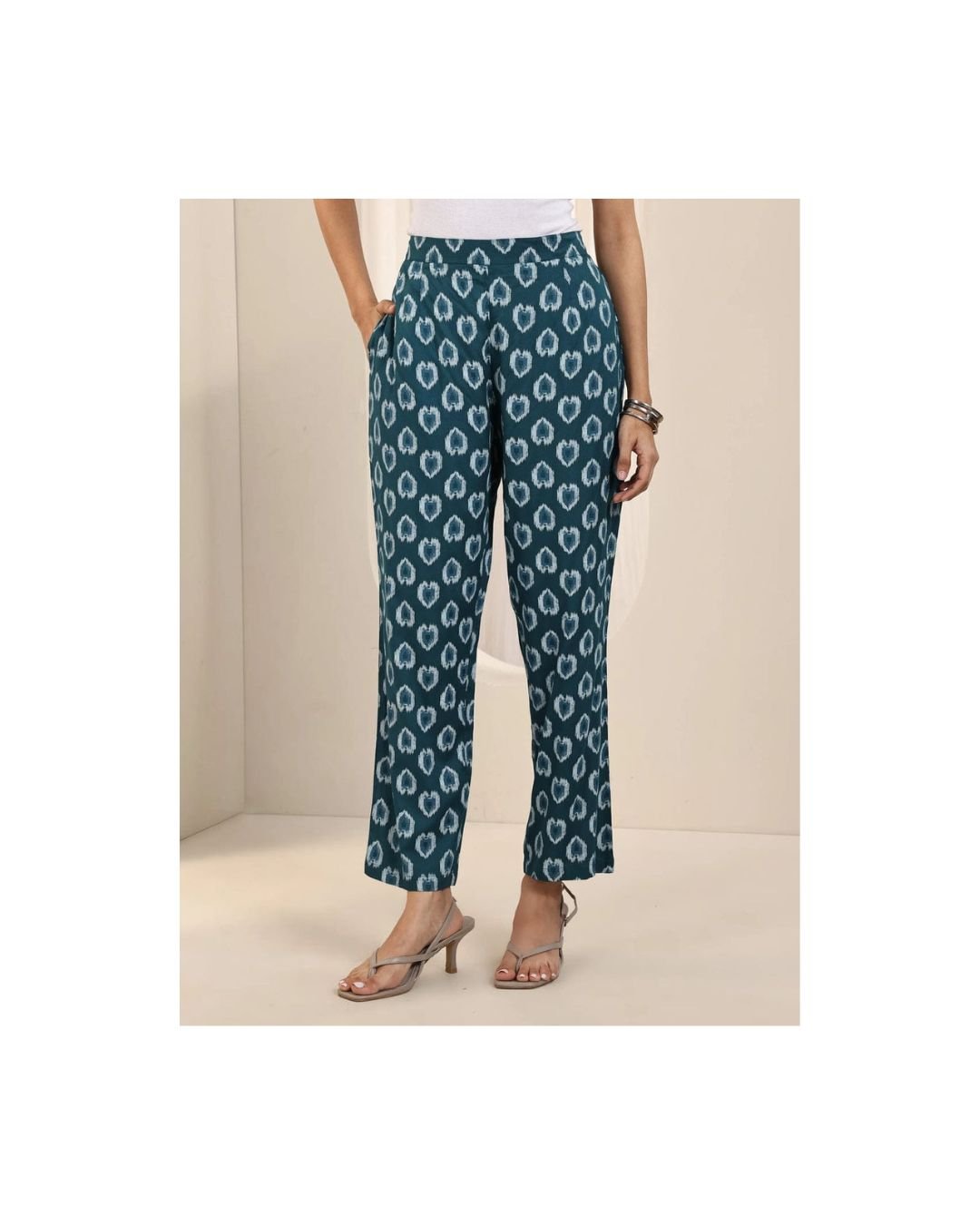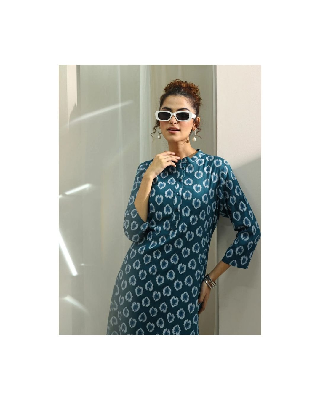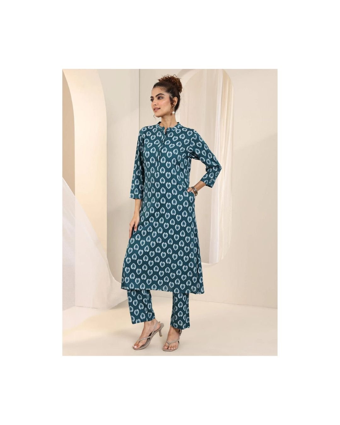 Its charm lies in the ikat-inspired print — abstract, repetitive motifs in white against a rich teal canvas, evoking artisanal strength with a contemporary heartbeat. Paired with ankle-length straight pants in the same print, the outfit holds harmony and balance from head to toe.