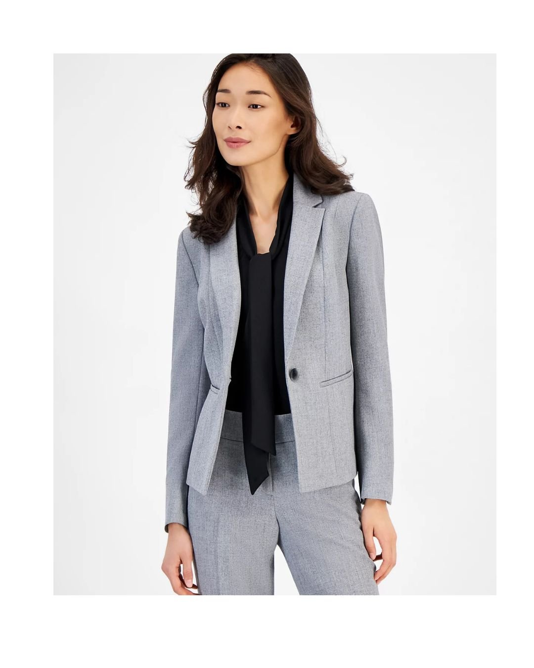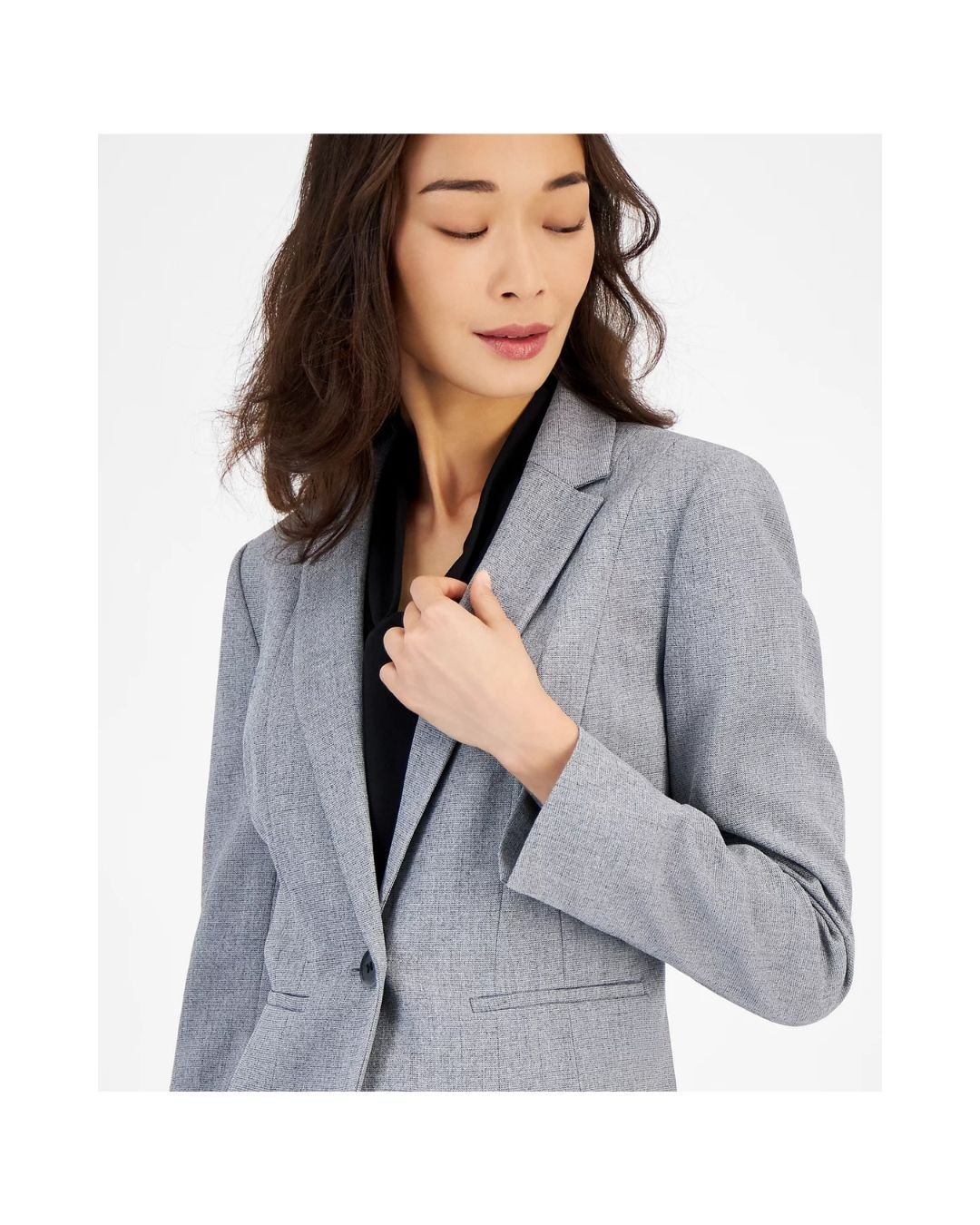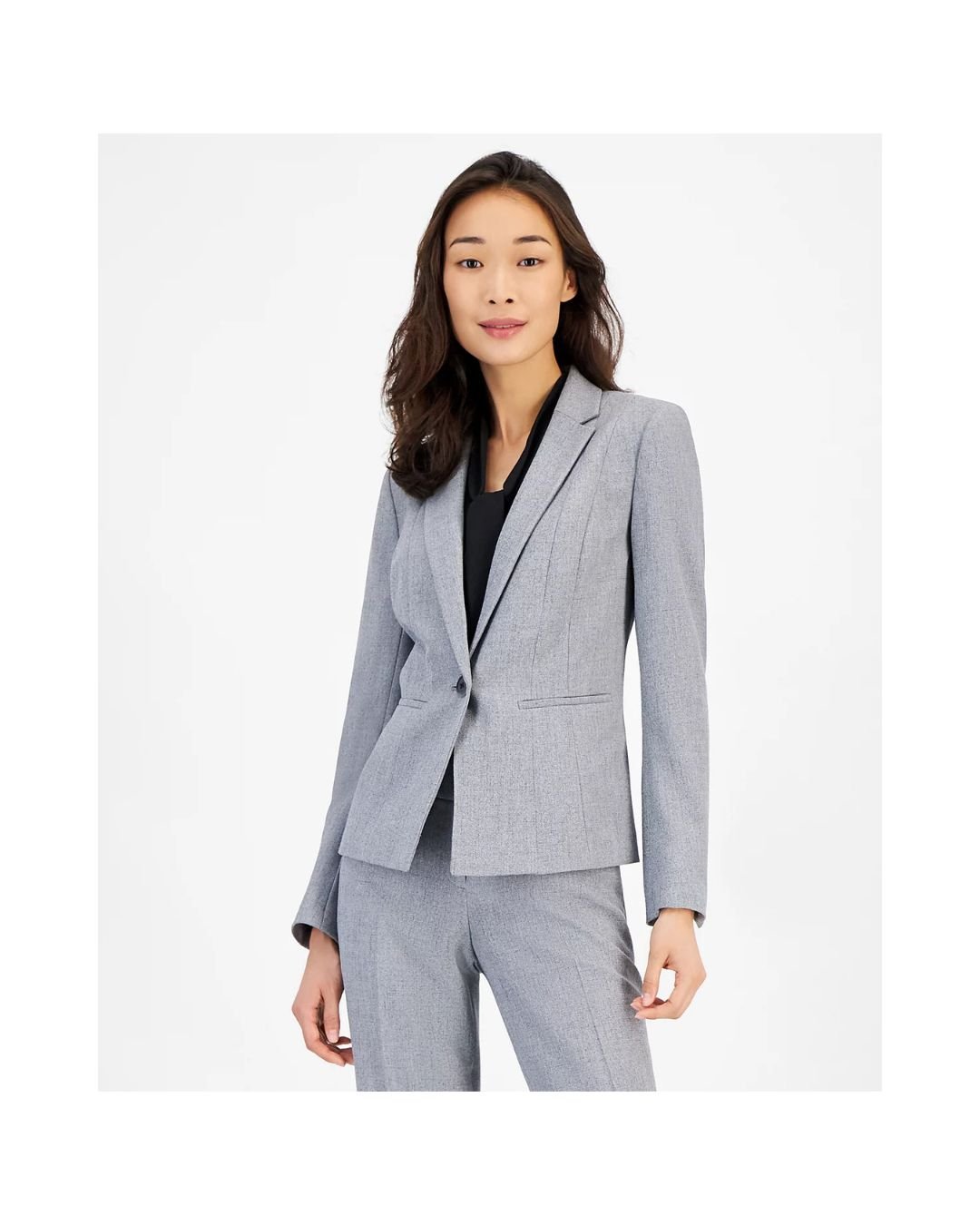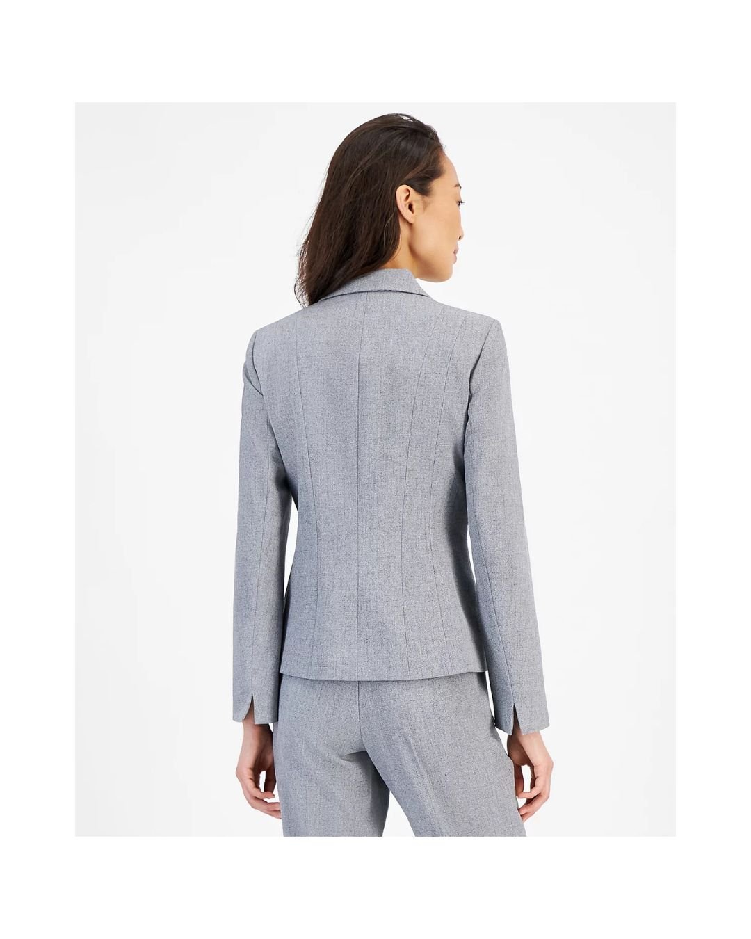 Made from premium, soft, and wrinkle-resistant suiting fabric, it ensures both comfort and style throughout the day. The slim, tailored fit beautifully complements your natural shape, while the sleek welt pockets add minimal yet functional detailing. The neutral grey shade makes it versatile and easy to pair with matching trousers, skirts, or jeans.